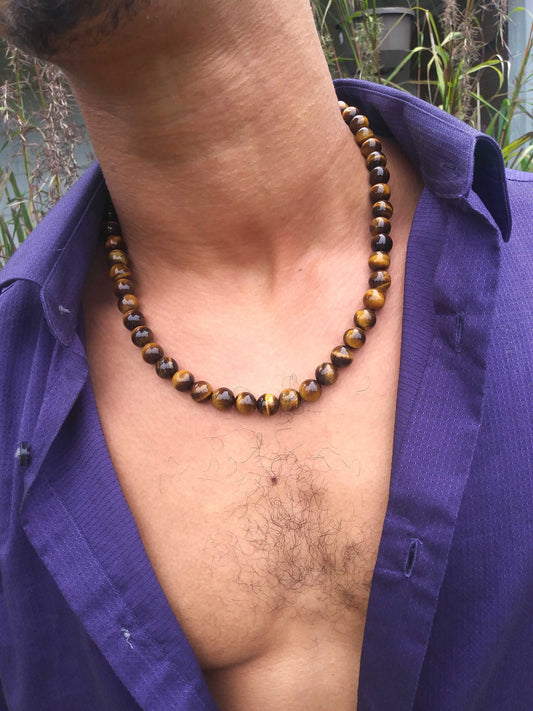 10mm Tiger Eye Necklace – Men’s Beaded Tribal Necklace for Confidence, Good Luck & Positive Energy | Magnetic Clasp