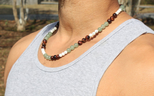Auras by Osiris Howlite, Aventurine & Red Tiger Eye Necklace 🌈 | 6mm/8mm Calm, Prosperity & Courage (Mexico Artisanal)