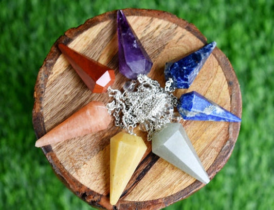 Set of 7 Chakra Faceted Cone Pendulums Healing Dowsing Crystal Pendulums