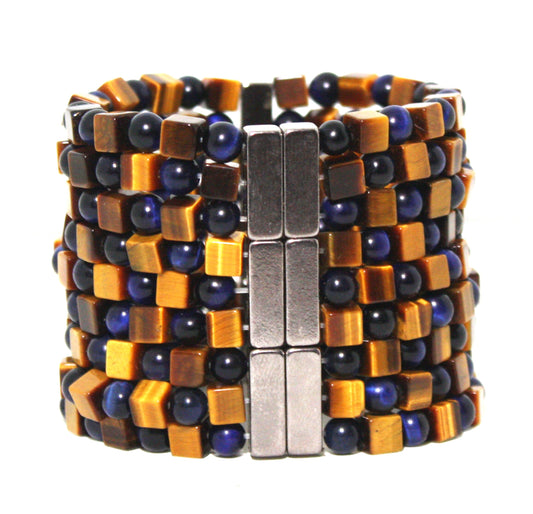 Auras by Osiris 9-Row Tiger Eye Tribal Warrior Bracelet 🐅 | Blue & Rare Cut Yellow Cubes | Neodymium Magnetic Energy Bracer