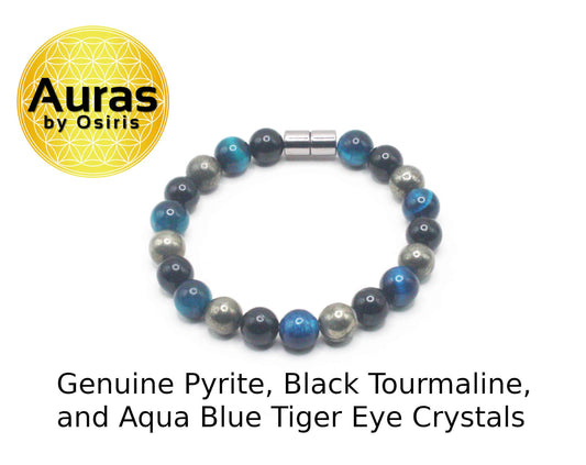 Auras by Osiris Triple Protection Bracelet (8mm) 🛡️💰 | Black Tourmaline, Pyrite & Aqua Blue Tiger Eye | EMF Shield, Wealth & Confidence w/ Strong Magnetic Clasp
