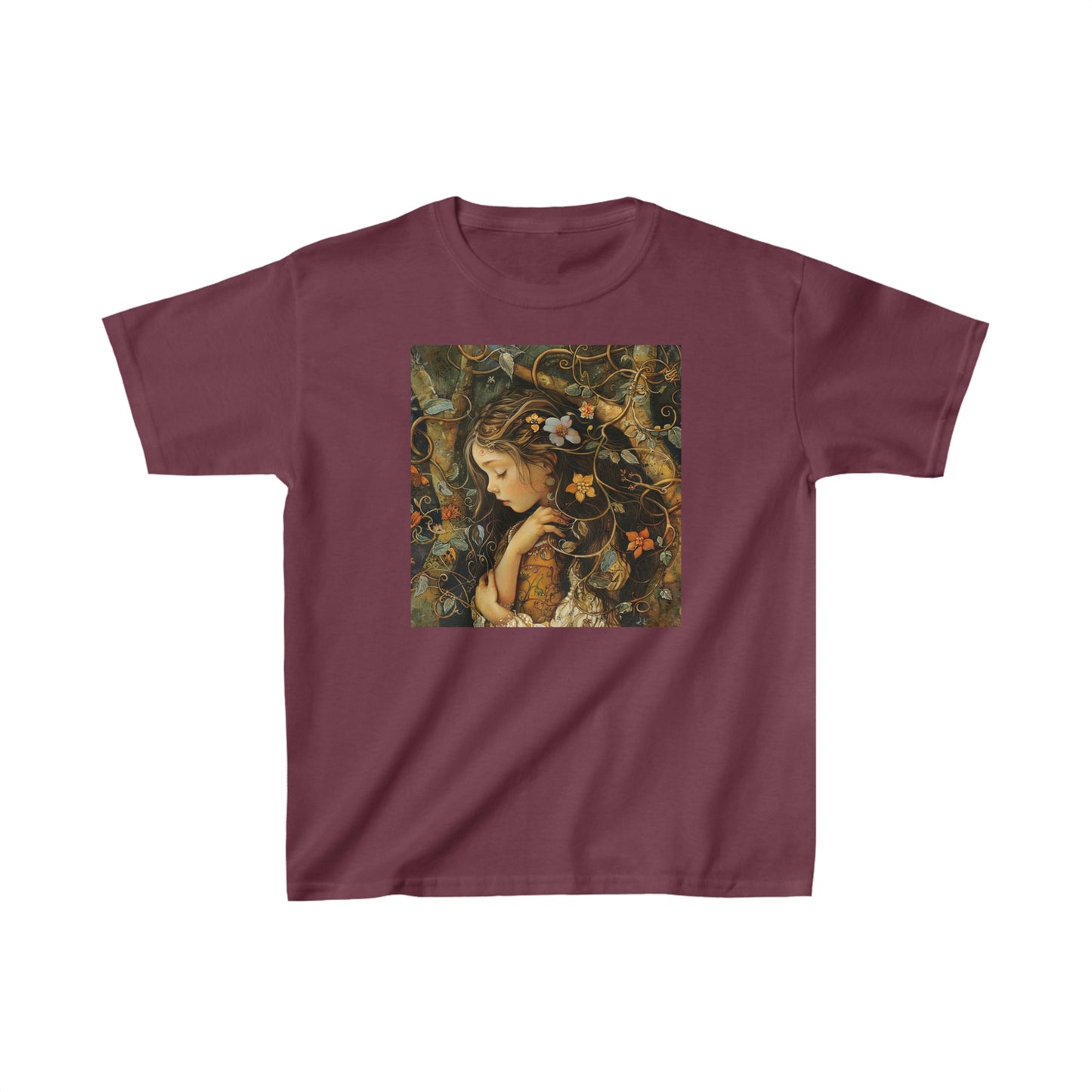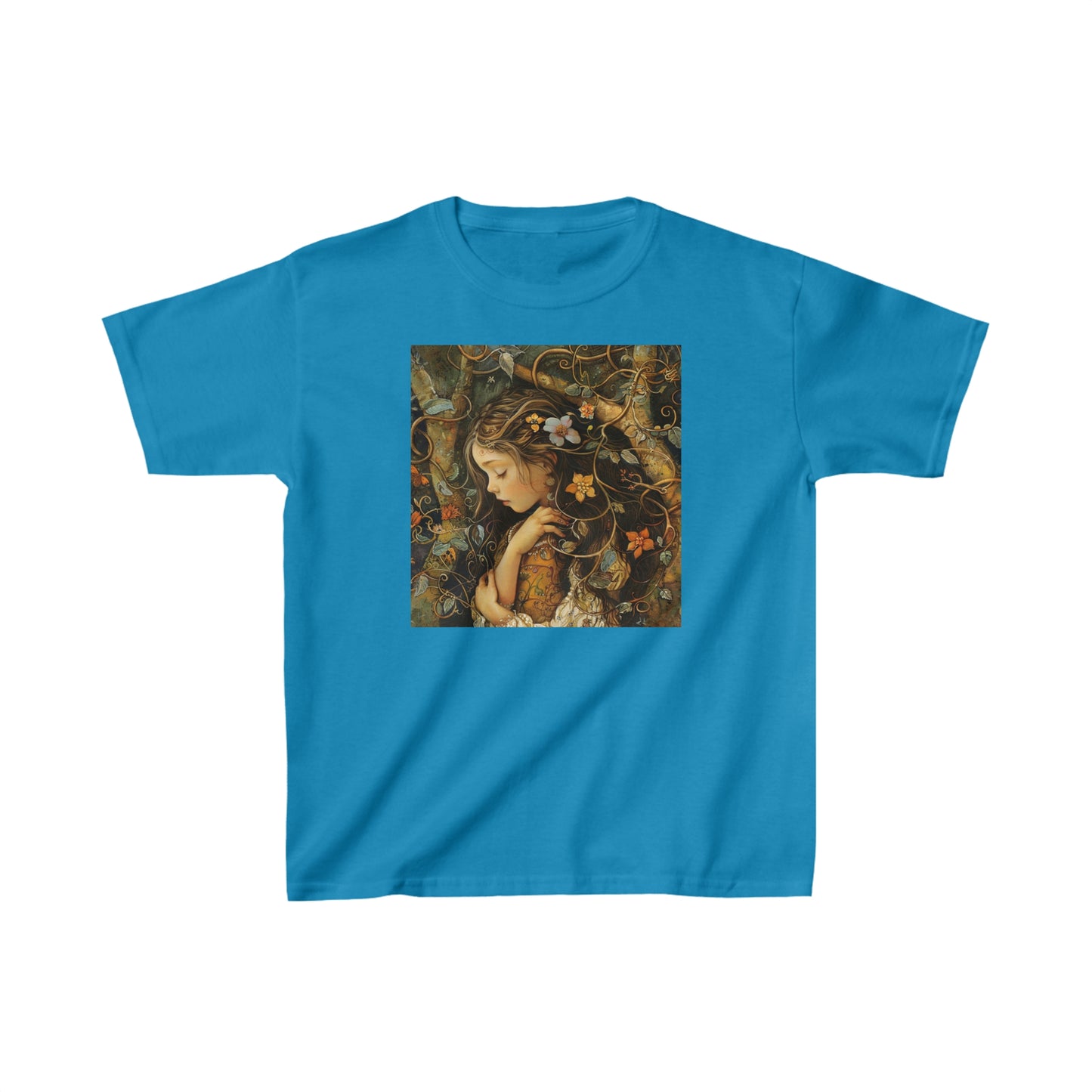 The kids heavy cotton tee is perfect for everyday use. The fabric is 100% cotton for solid colors. Polyester is included for heather-color variants. These fabrics are prime materials for printing. The shoulders have twill tape for improved durability. The collar is curl resistant due to ribbed knitting. There are no seams along the sides.